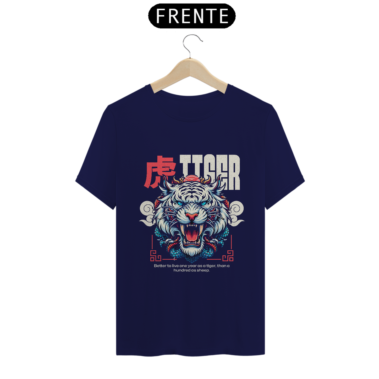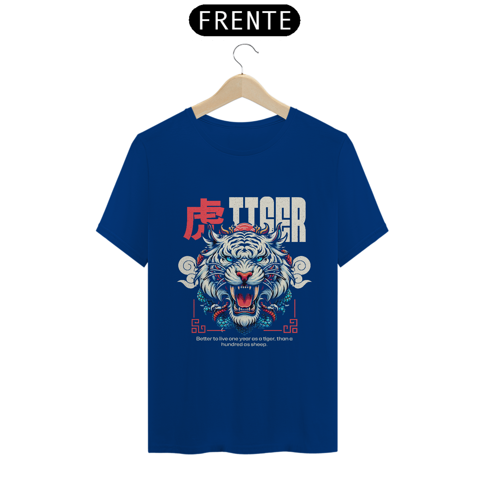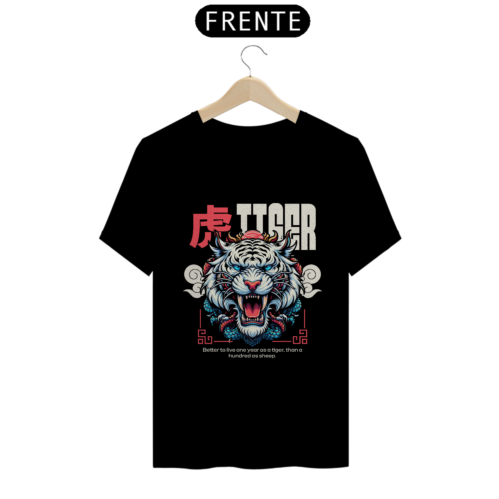 estampa dessa camiseta clássica traz um tigre em posição frontal, com a boca aberta em um rugido intenso, transmitindo força, coragem e domínio. O tigre é ilustrado em um estilo oriental moderno, com traços detalhados, cores vibrantes e expressão feroz.