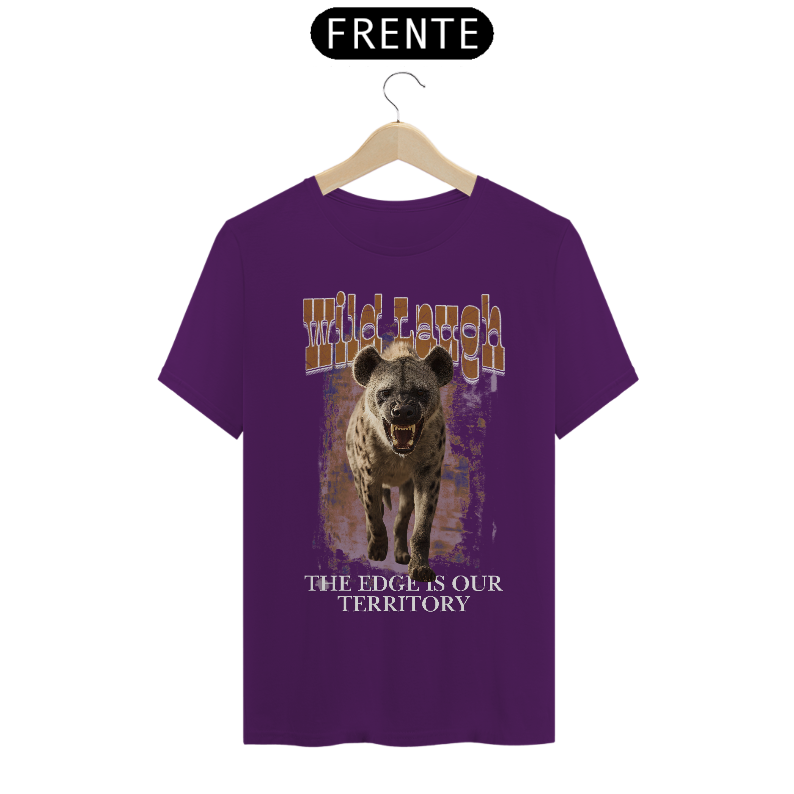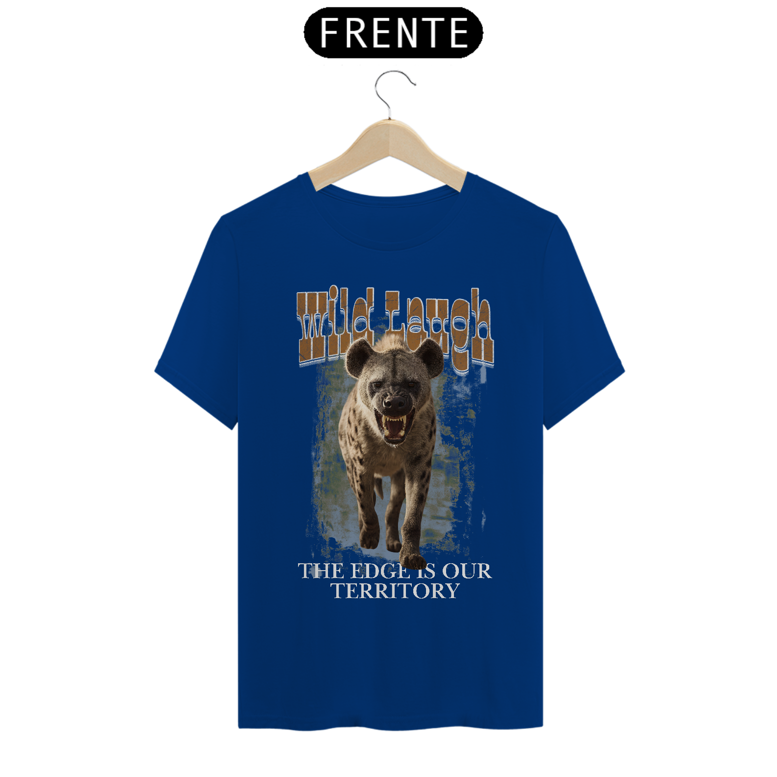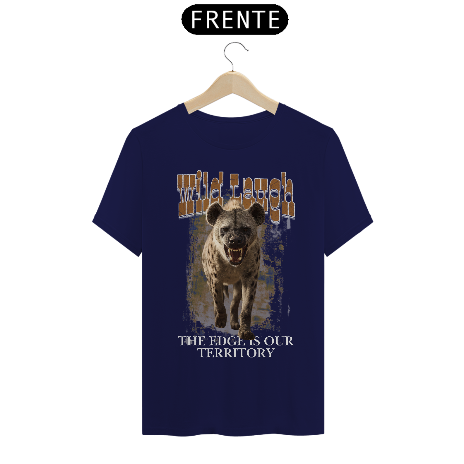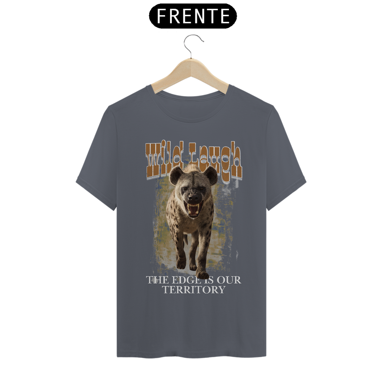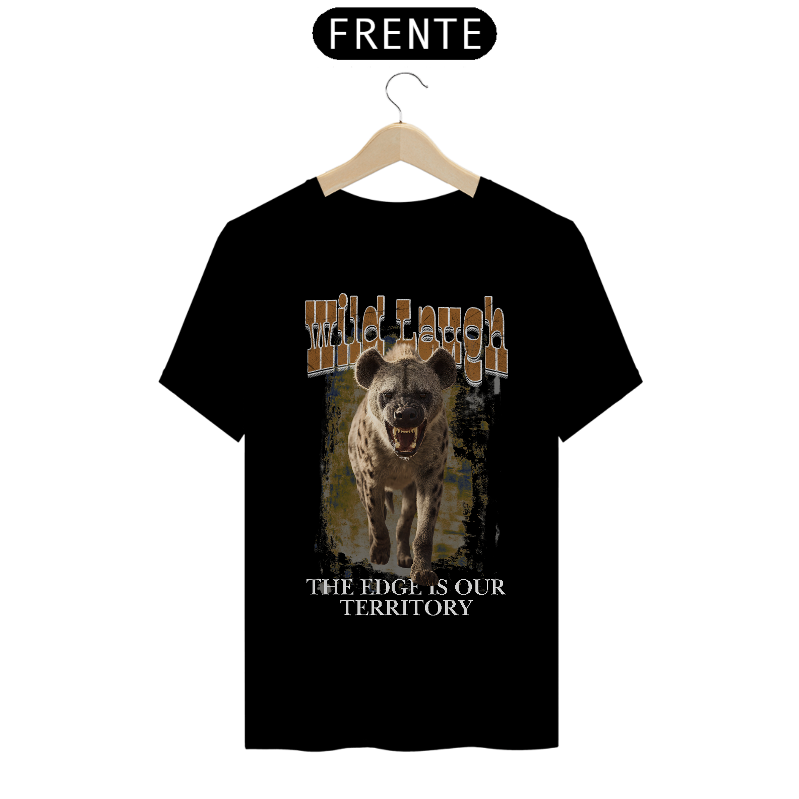 A arte traz uma hiena em movimento, avançando com olhar desafiador e expressão feroz. O enquadramento frontal cria impacto imediato, transmitindo domínio, instinto e resistência. O fundo com textura desgastada reforça a estética street vintage, enquanto o lettering retrô “Wild Laugh” adiciona personalidade e identidade à peça.