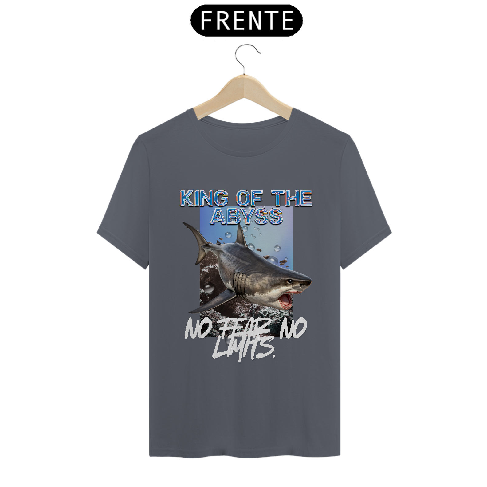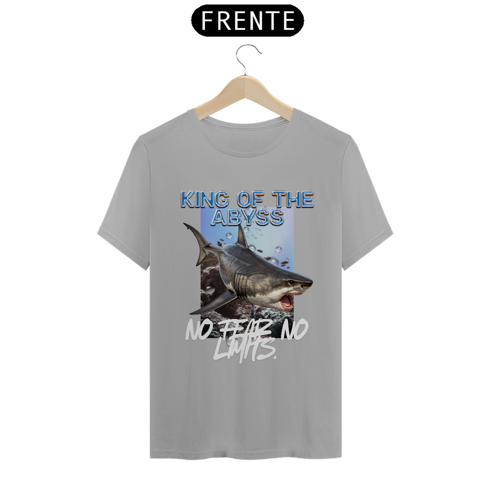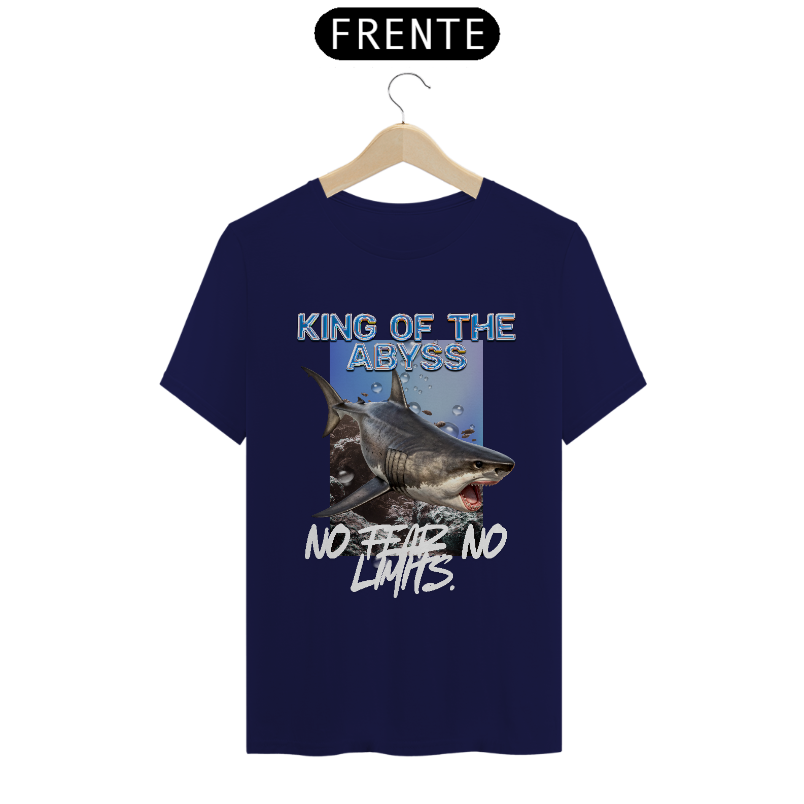 Acima, o título "KING OF THE ABYSS" (Rei do Abismo) coroa a imagem. Abaixo, o lema "NO FEAR NO LIGHTS" (Sem Medo, Sem Luz) define a atitude: uma referência às águas escuras onde o tubarão reina com absoluta confiança, sem necessidade de orientação ou temor.