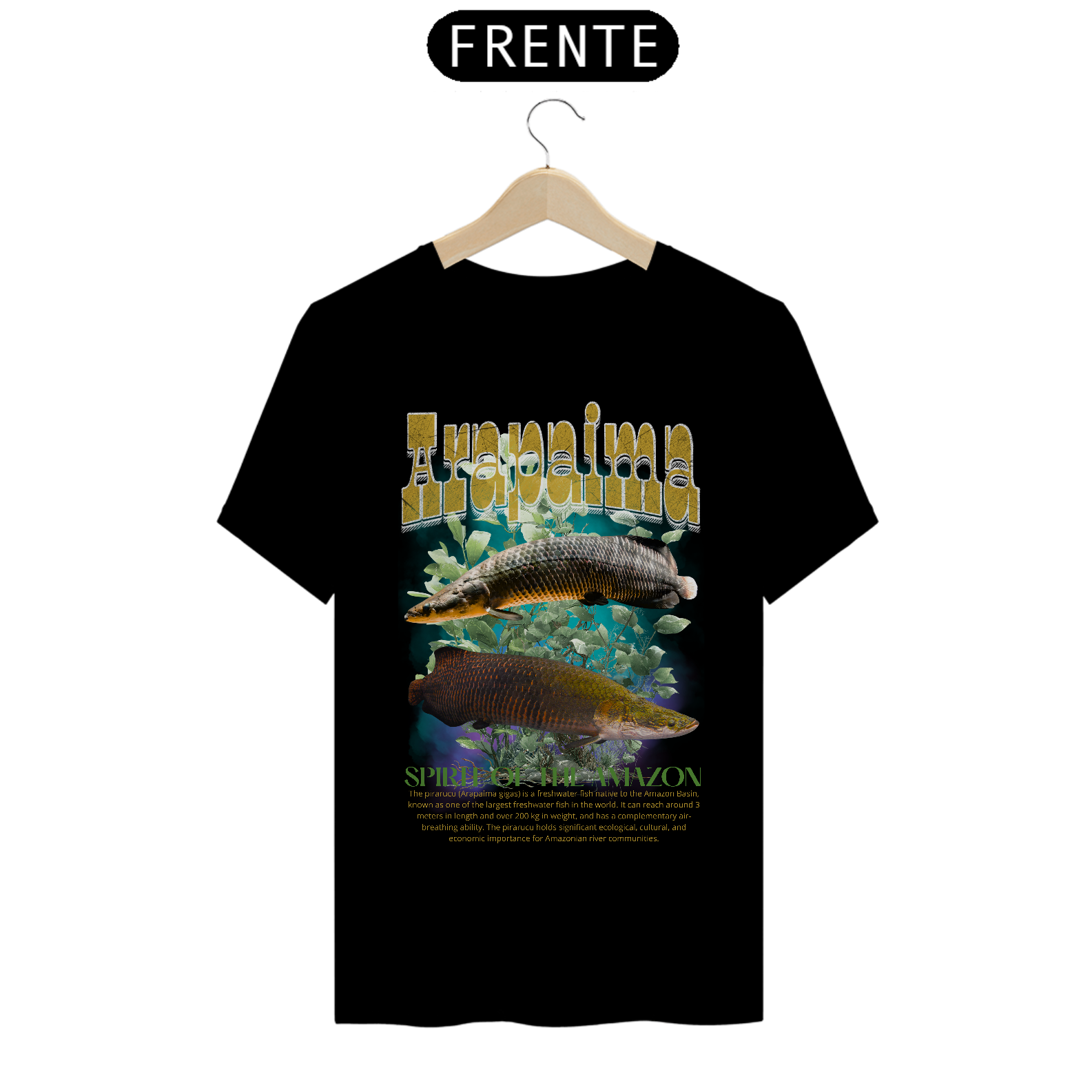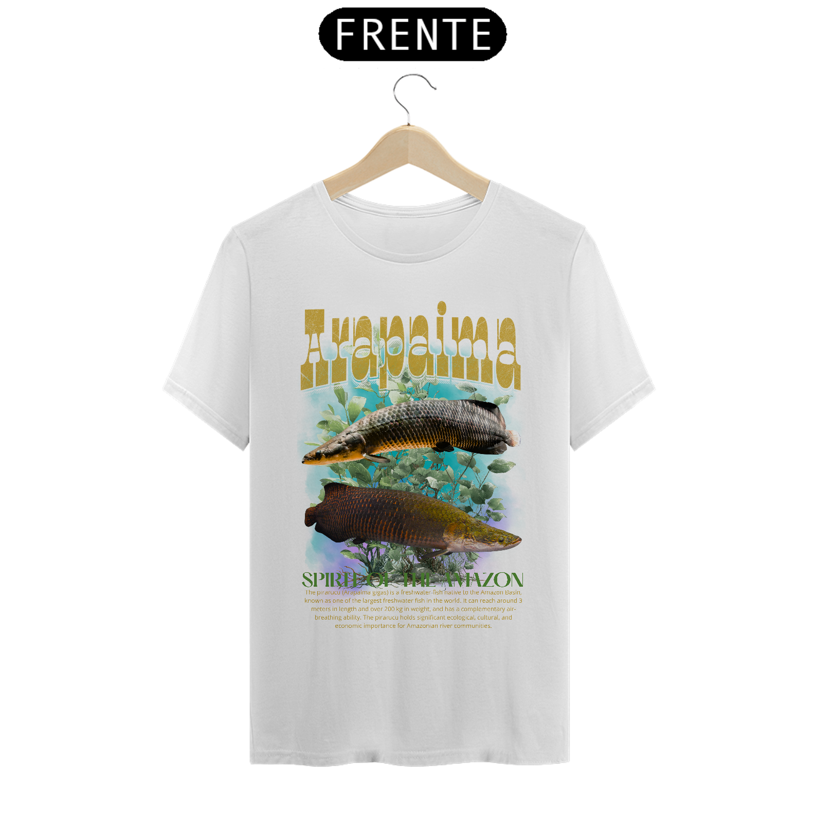 Ao fundo, surgem plantas aquáticas envoltas por uma névoa em tons de azul, evocando a profundidade e o mistério dos rios da Amazônia. O visual transmite serenidade e poder natural ao mesmo tempo. Finalizando a estampa, o título “Arapaima” aparece na parte superior, enquanto a frase em inglês “Spirit of the Amazon” é aplicada abaixo da imagem, reforçando o caráter místico e cultural da peça.