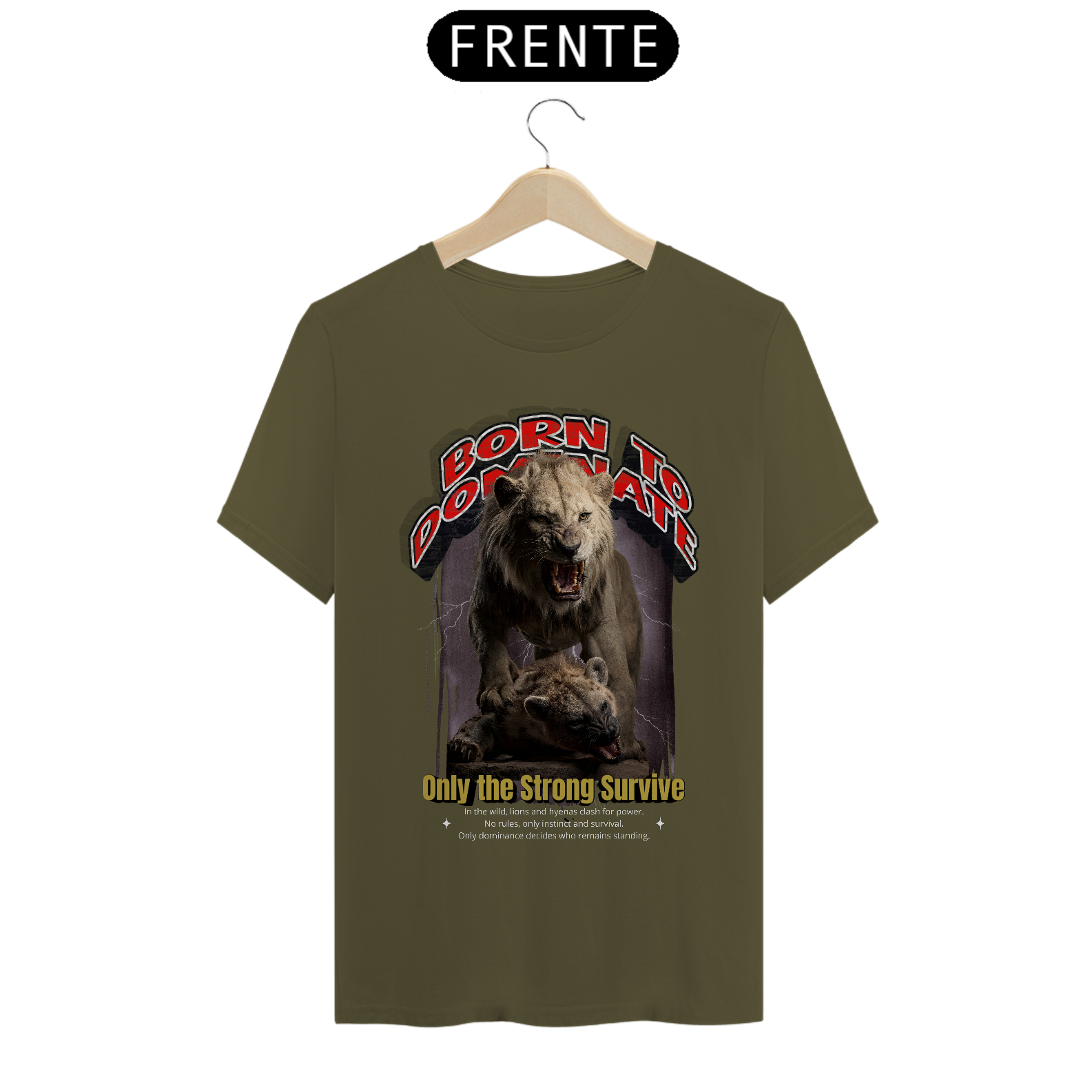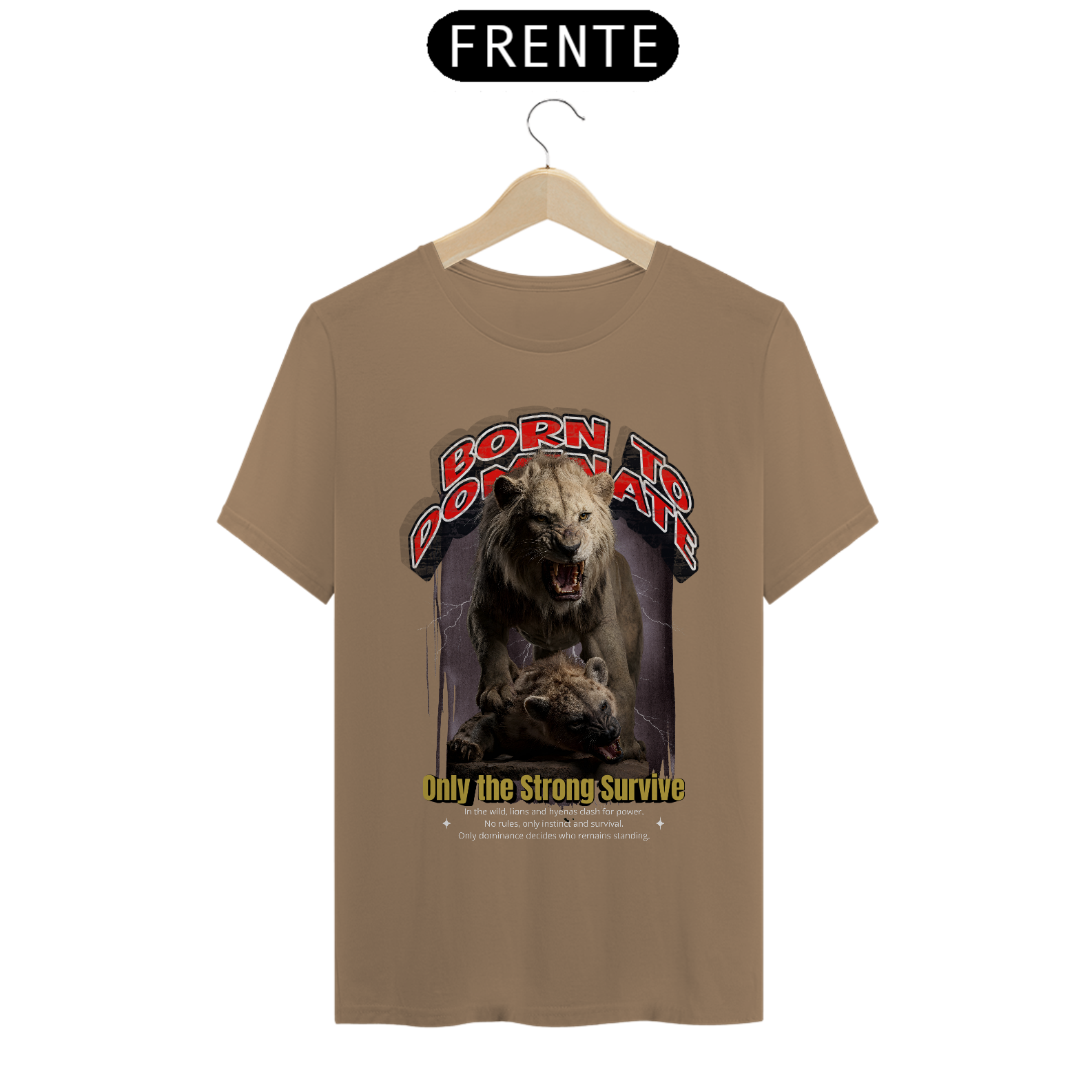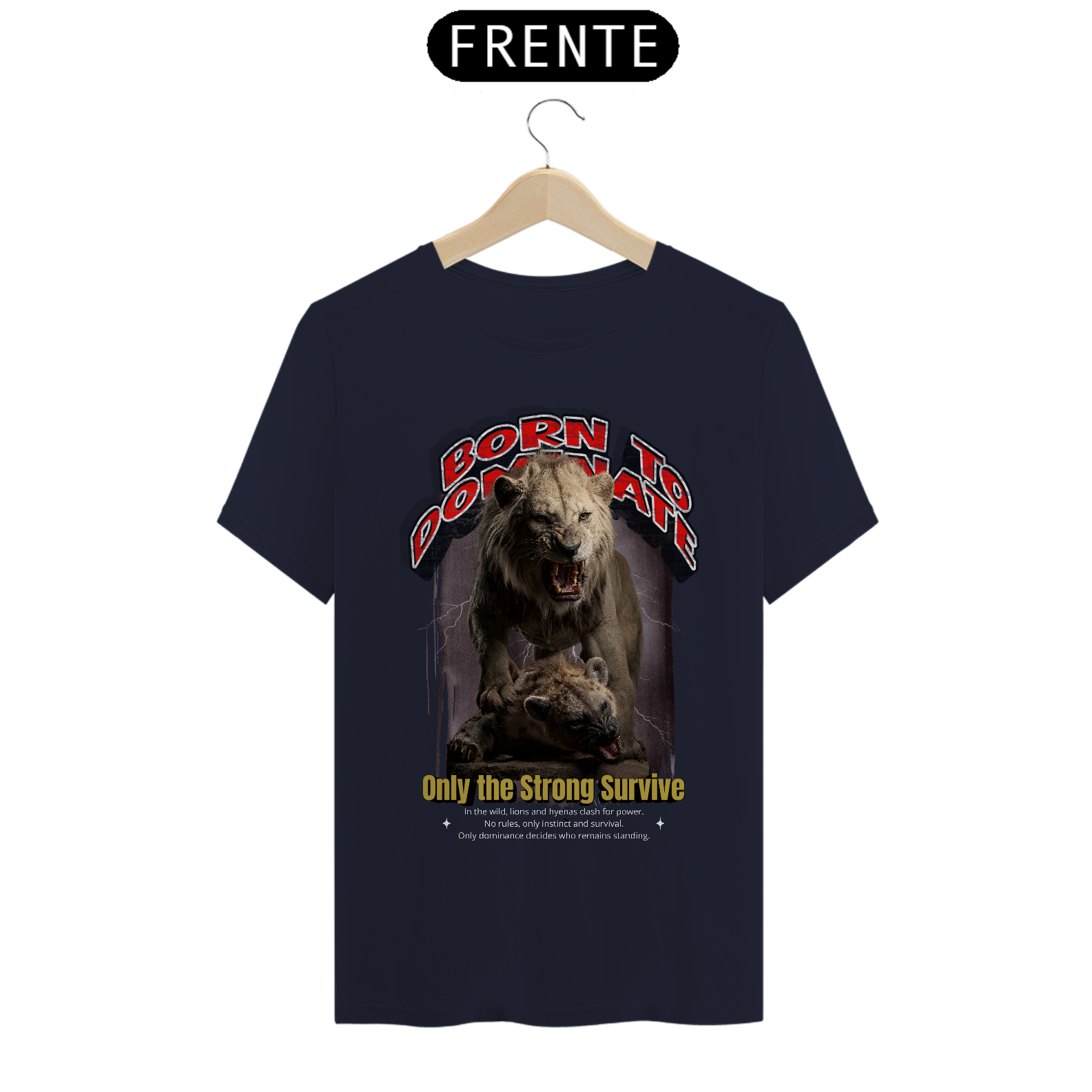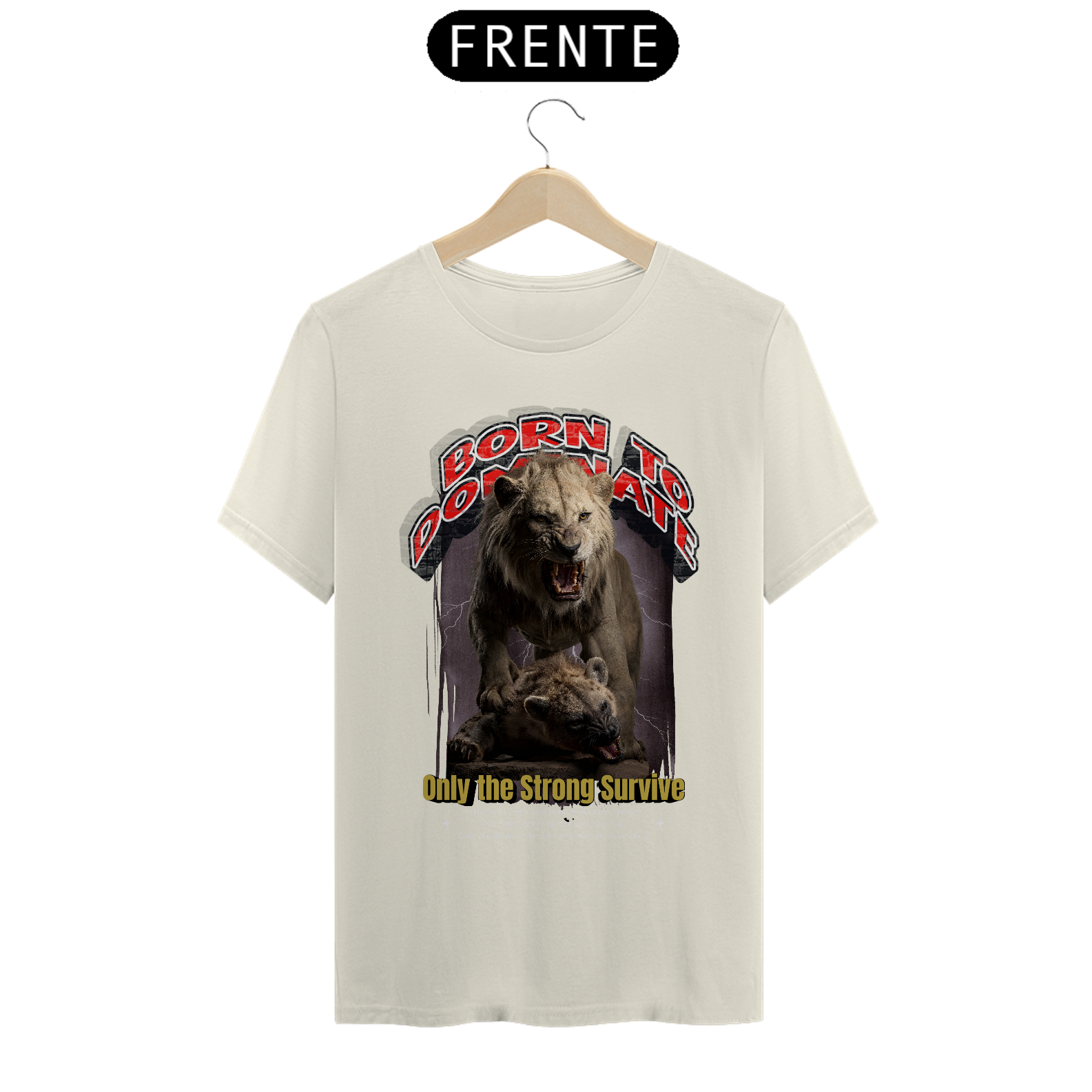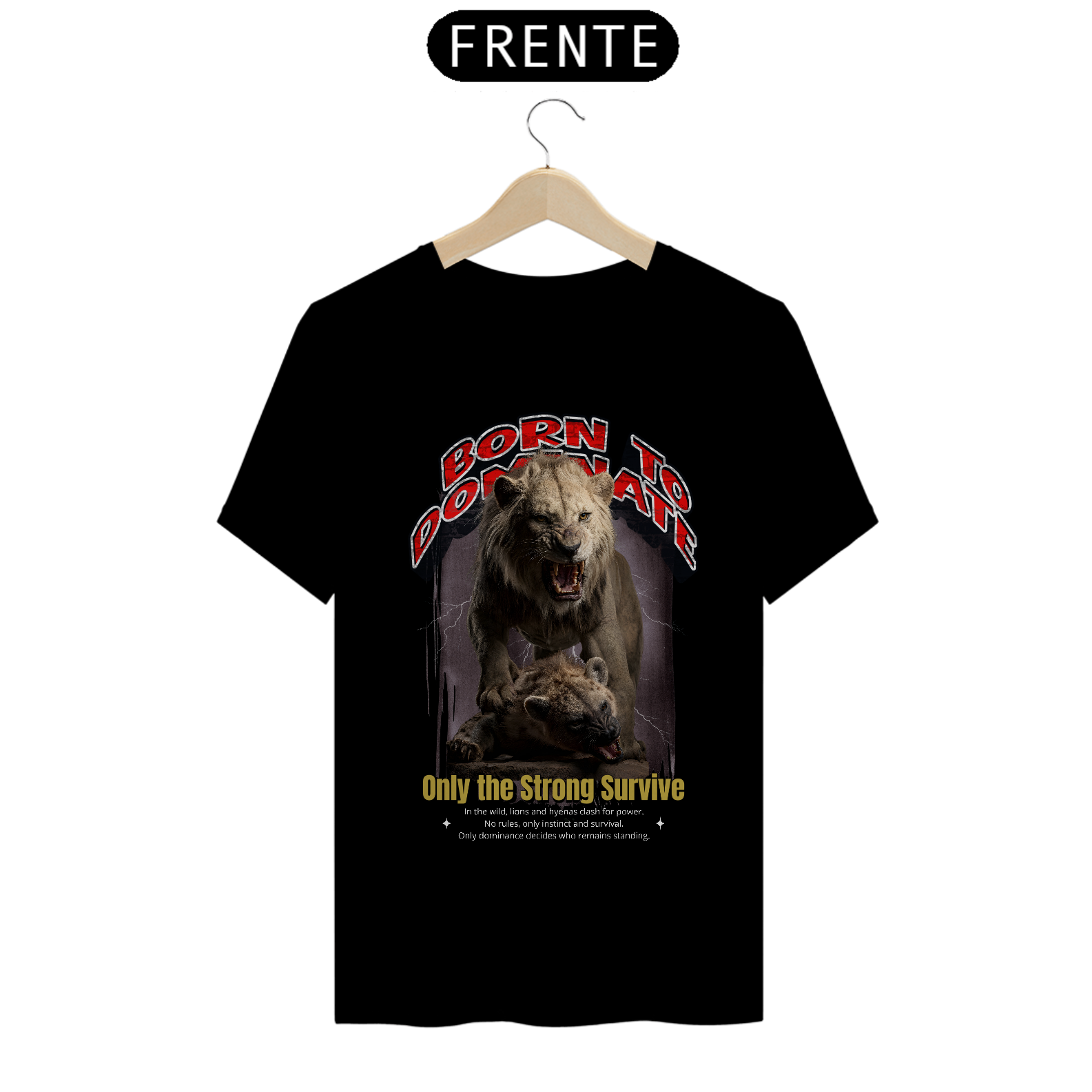 Esta camiseta traz uma arte impactante e cheia de significado, ideal para quem valoriza força, resiliência e atitude. Na estampa, um leão poderoso domina cenicamente sobre uma hiena, representando a luta pela sobrevivência e a hierarquia da natureza. A cena transmite a essência da mensagem "Only the Strong Survive" (Apenas os Fortes Sobrevivem), com um visual selvagem e autêntico.