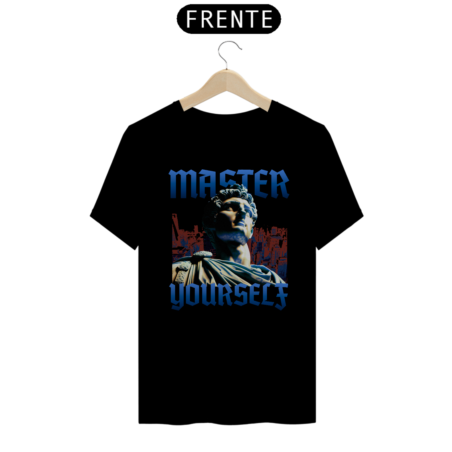 A camiseta preta absorve a luz como um silêncio profundo — firme, estável, sem distrações. Nada chama mais atenção do que deveria.