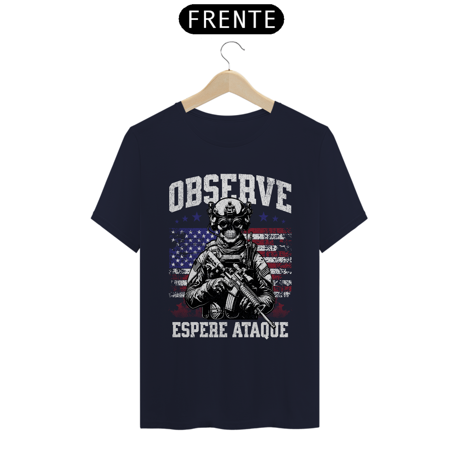 No peito, a imagem de um soldado em prontidão — não em combate,