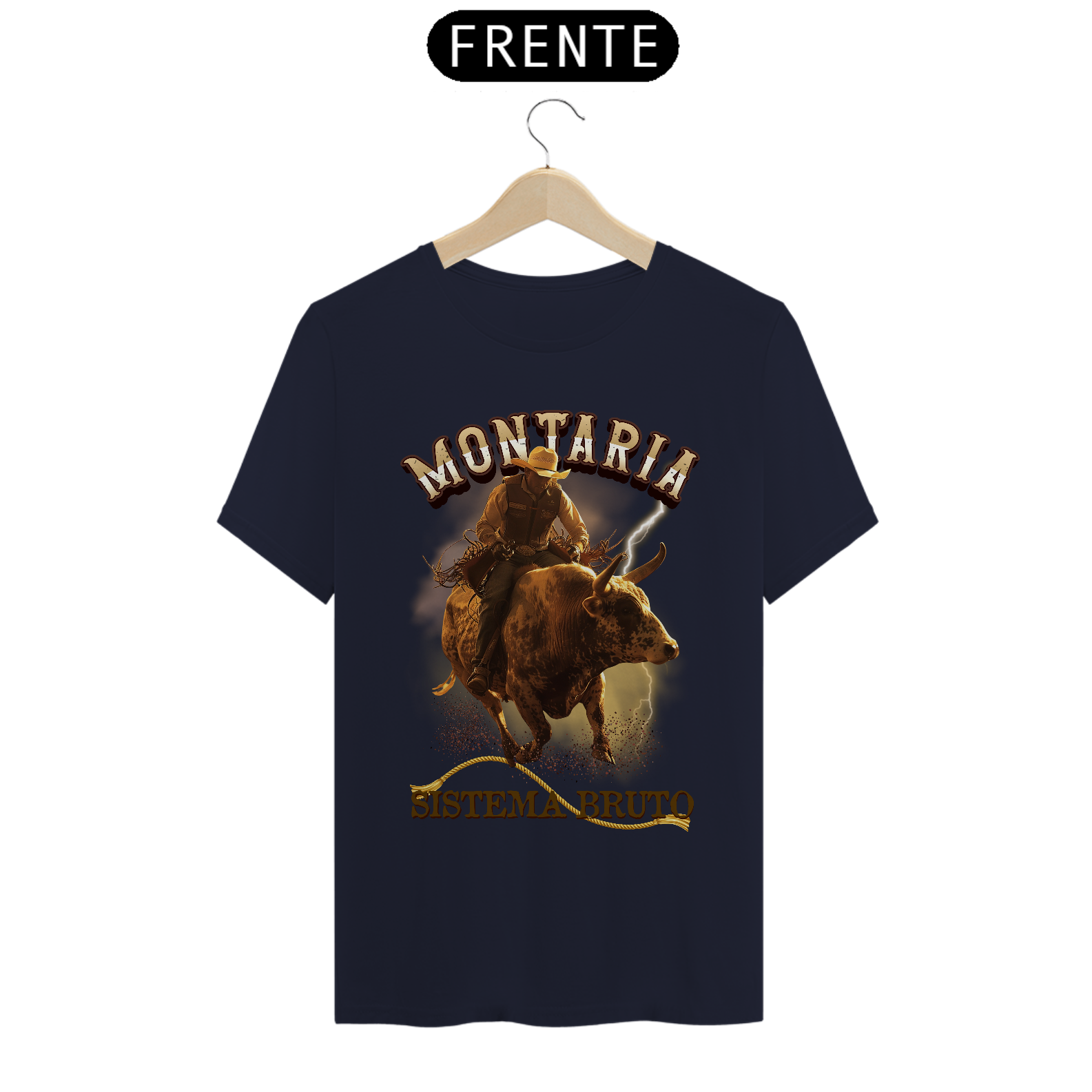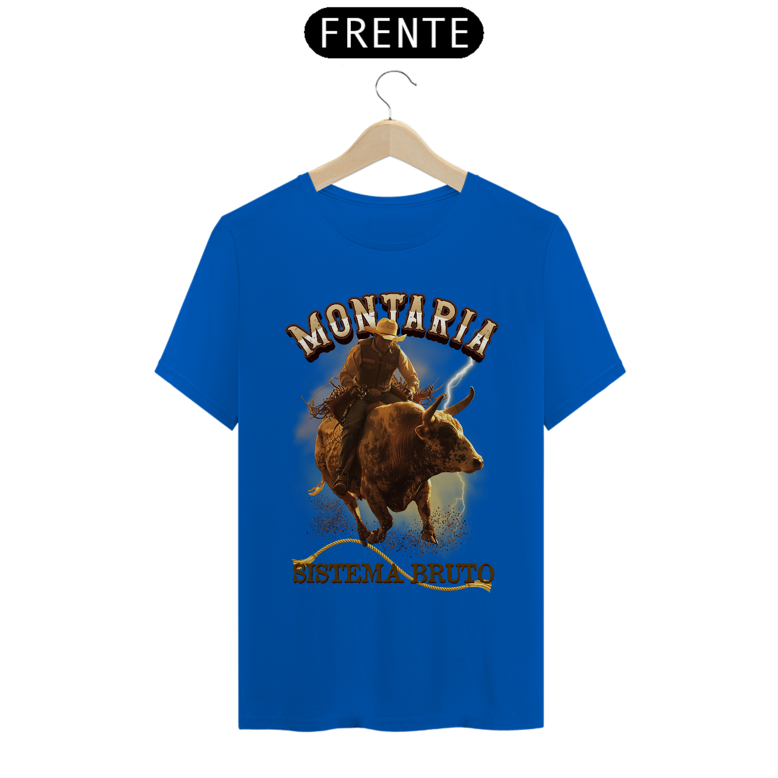 No topo da arte, o título “MONTARIA” aparece com tipografia marcante e robusta, reforçando a potência da cena. Abaixo da imagem, a frase “SISTEMA BRUTO” complementa a estampa com identidade forte, transmitindo a essência da cultura sertaneja e do espírito do rodeio.