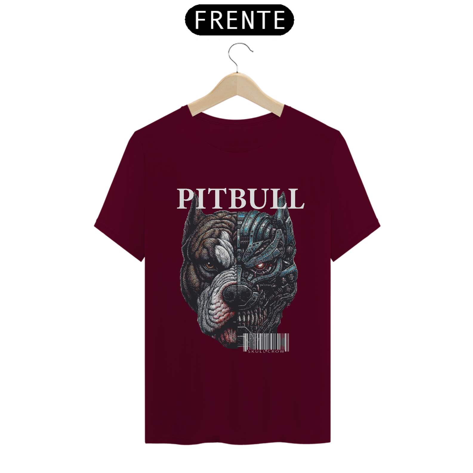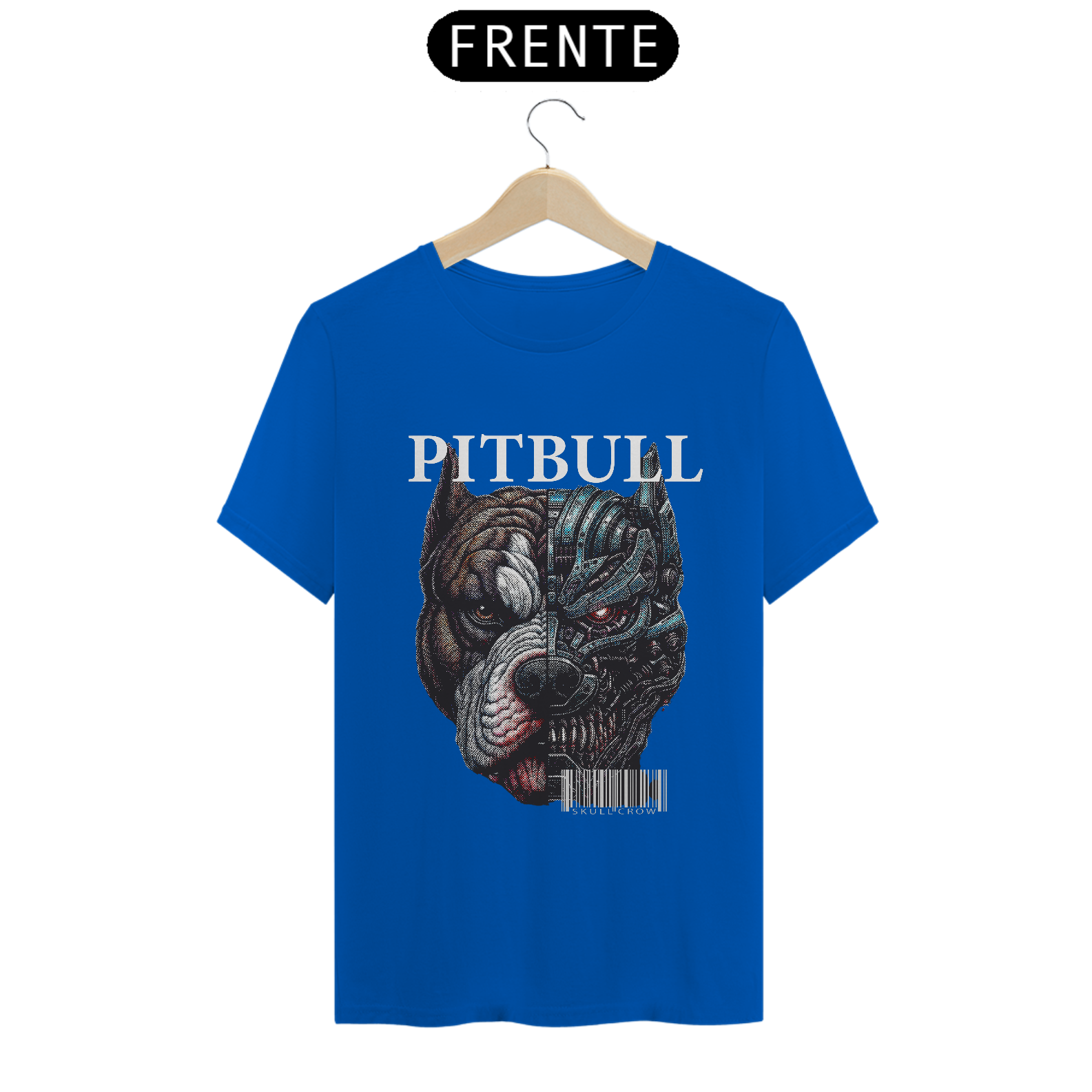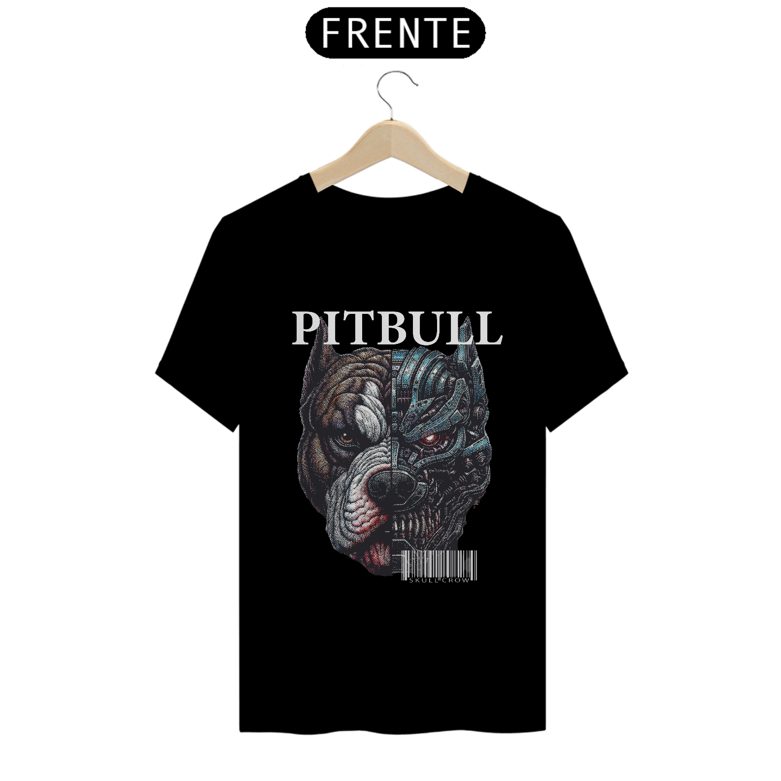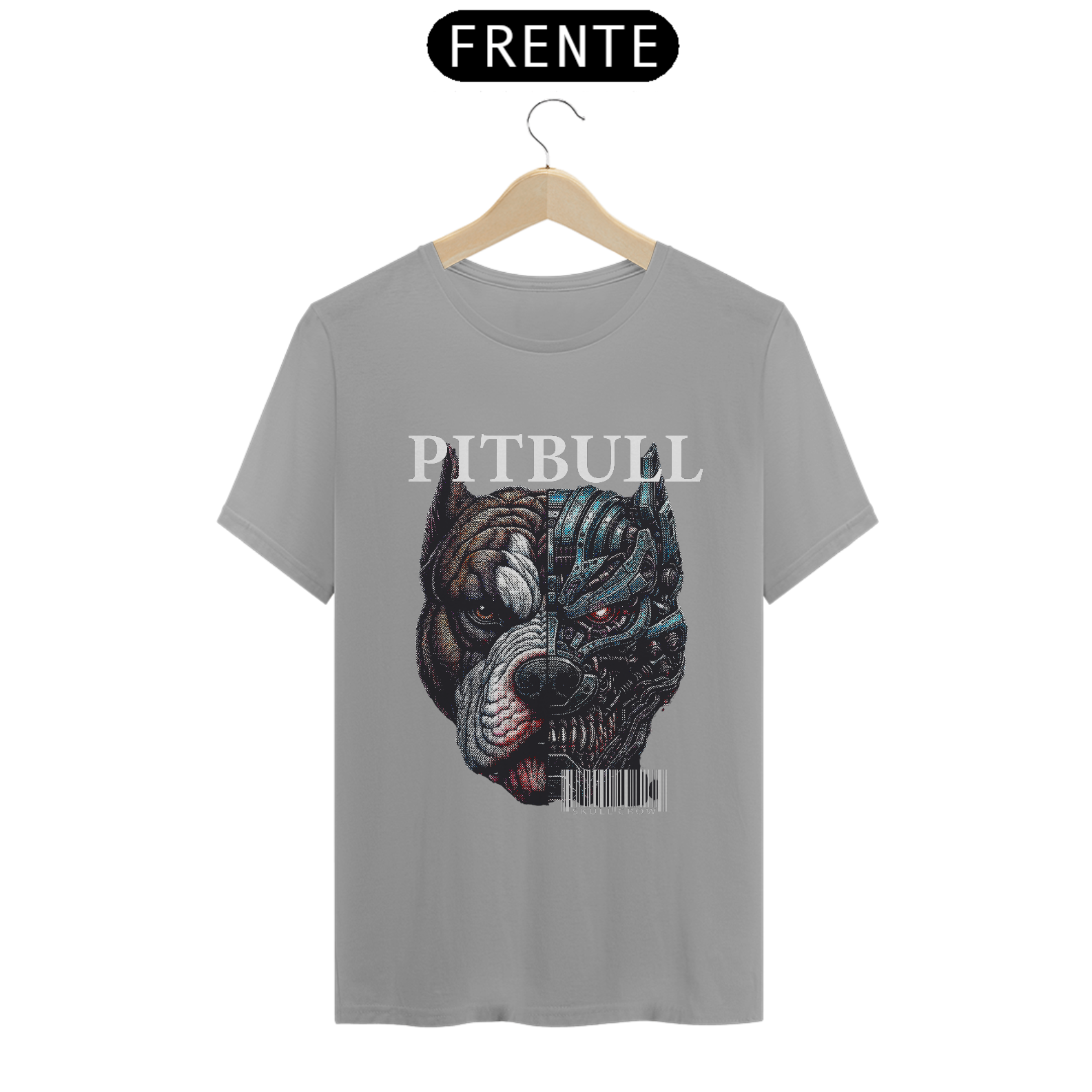 A camiseta Quality apresenta uma estampa impactante e futurista de um pitbull dividido ao meio, criando um forte contraste visual: