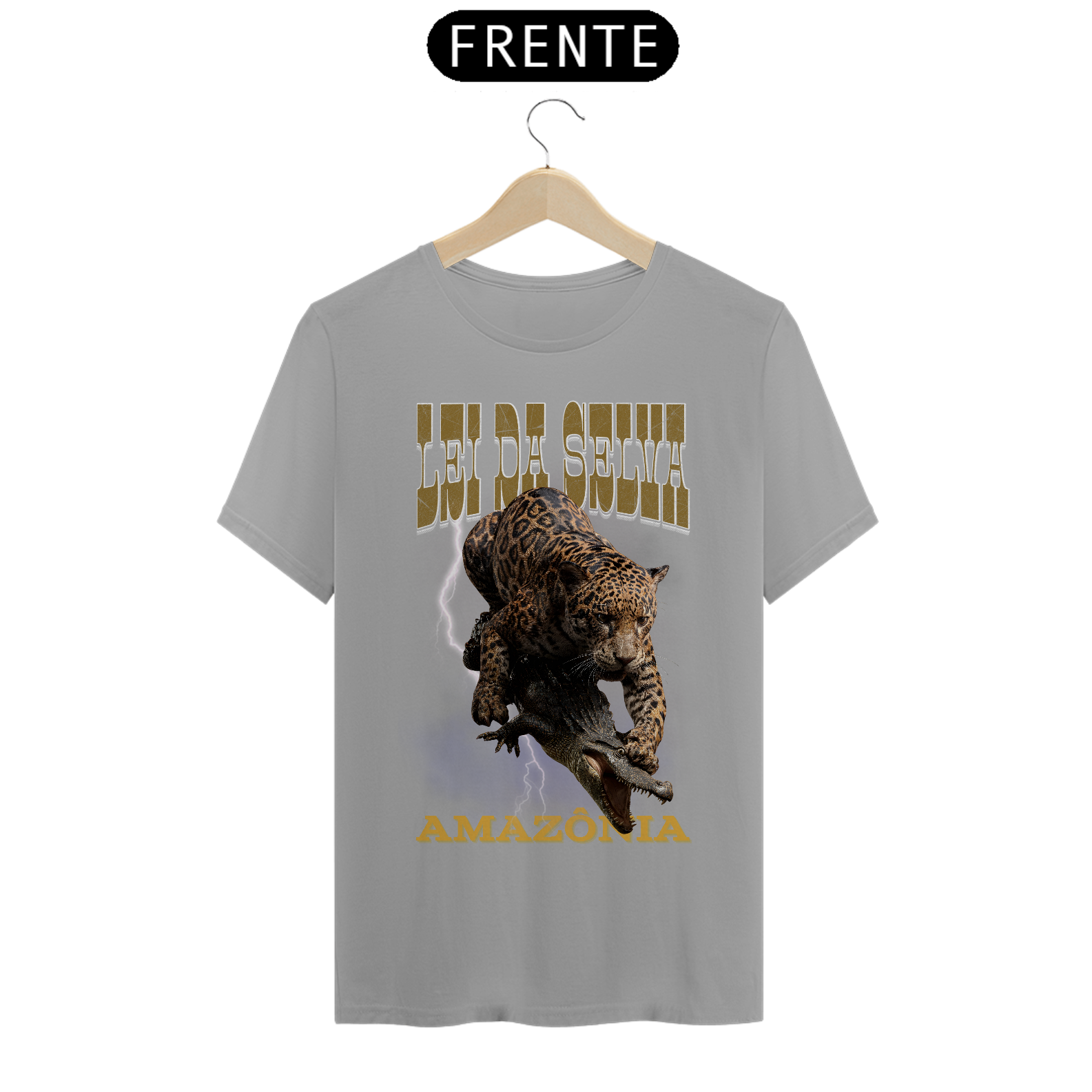 • Costas: Logotipo estilizado "Lei da Selva - Amazônia" abaixo da gola, em tipografia orgânica e resistente.