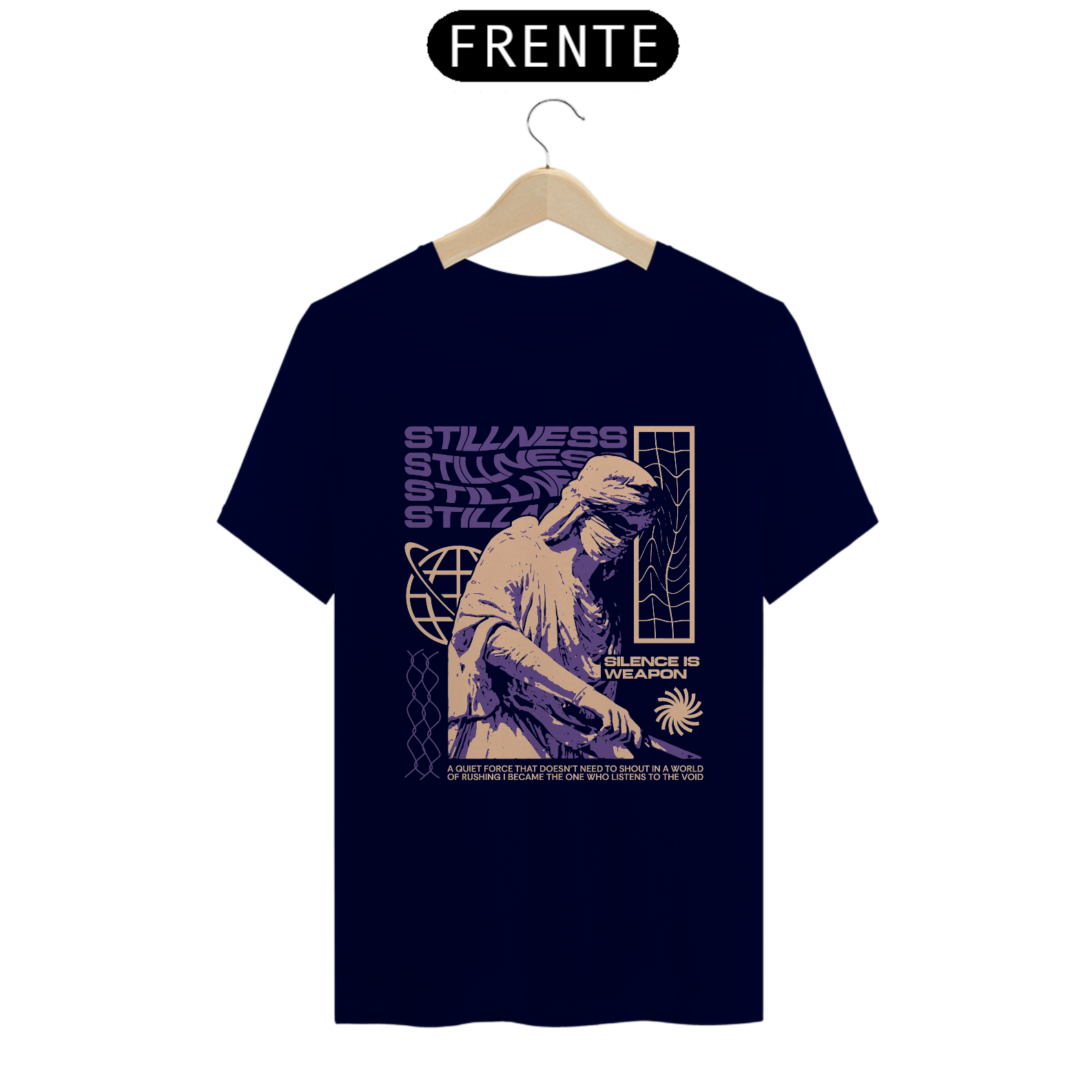 Com um design minimalista e impacto visual profundo, a peça traz a palavra STILLNESS estampada de forma marcante, acompanhada da frase que define uma filosofia: