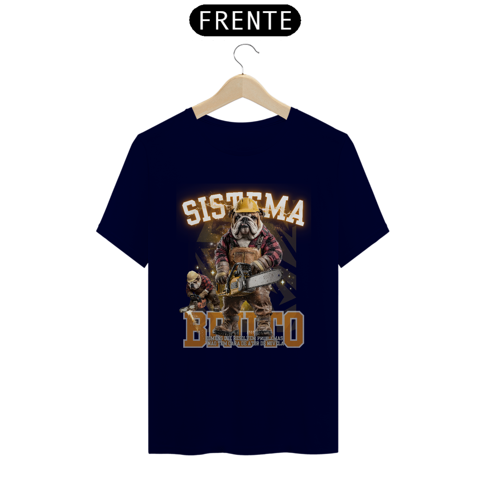 A Camiseta Sistema Bruto representa quem não foge do trabalho pesado e resolve no braço. A estampa traz um bulldog imponente vestido como lenhador, segurando uma motosserra — símbolo de força, resistência e atitude.