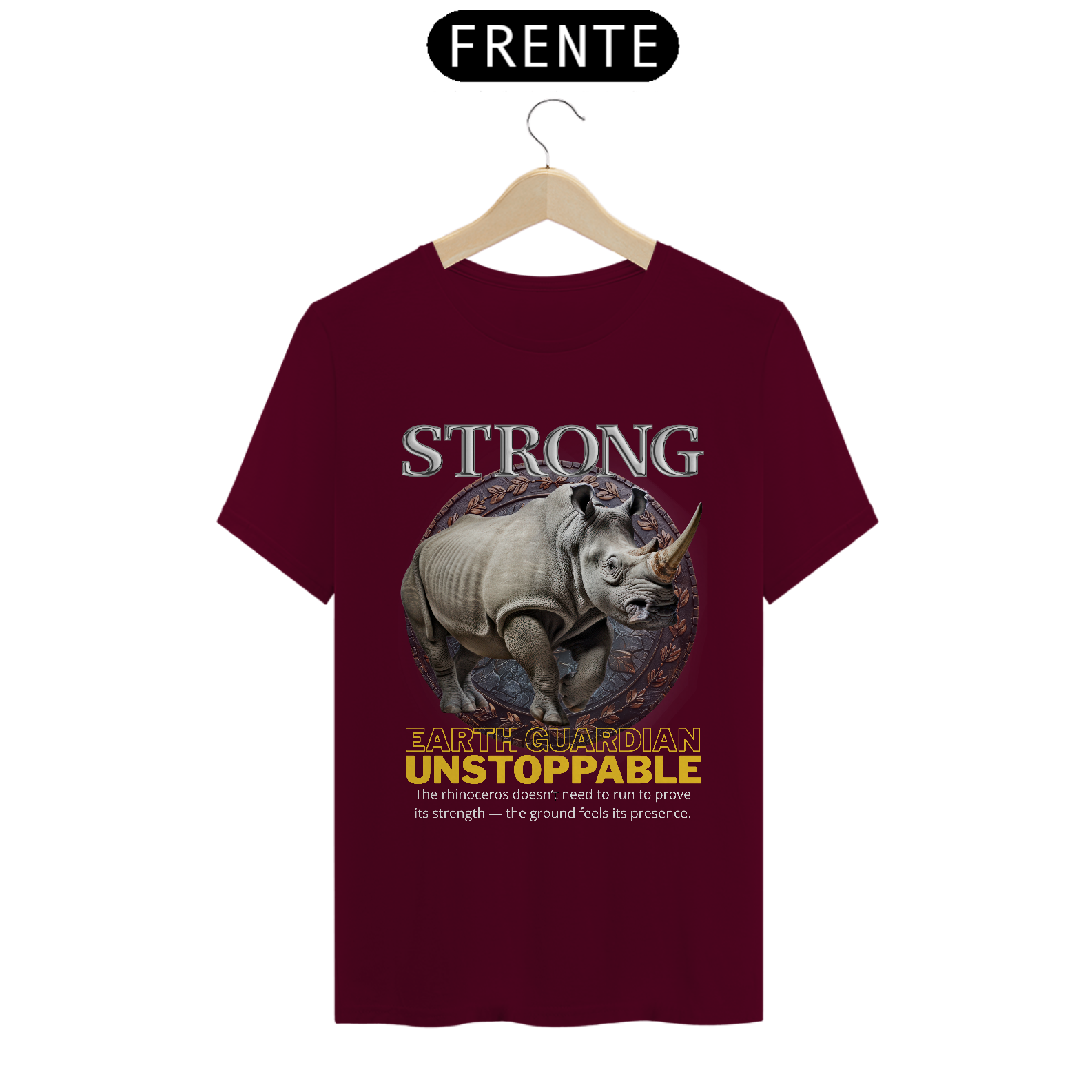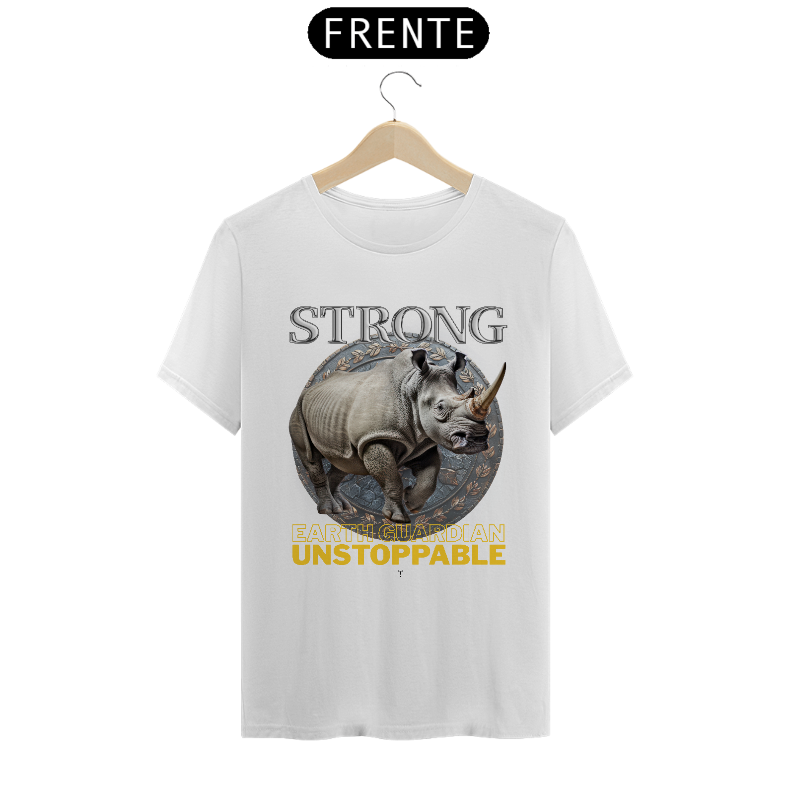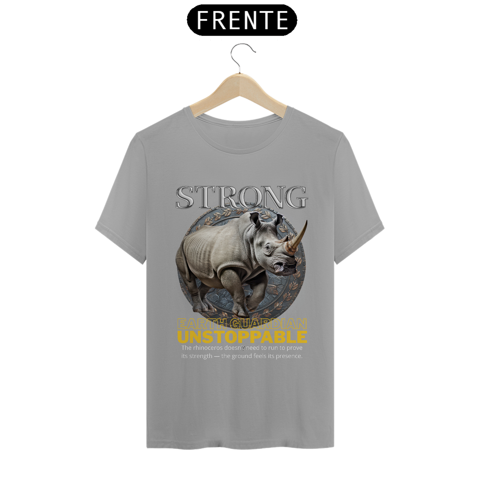 A arte central apresenta um rinoceronte em estilo realista, com riqueza de detalhes que destacam sua couraça natural e postura firme. O animal é envolvido por um emblema circular que remete a símbolo de proteção e poder, reforçando a mensagem da estampa. As palavras “STRONG” e “EARTH GUARDIAN – UNSTOPPABLE” completam o visual com um conceito forte: o rinoceronte como guardião da terra, símbolo de estabilidade e domínio silencioso.